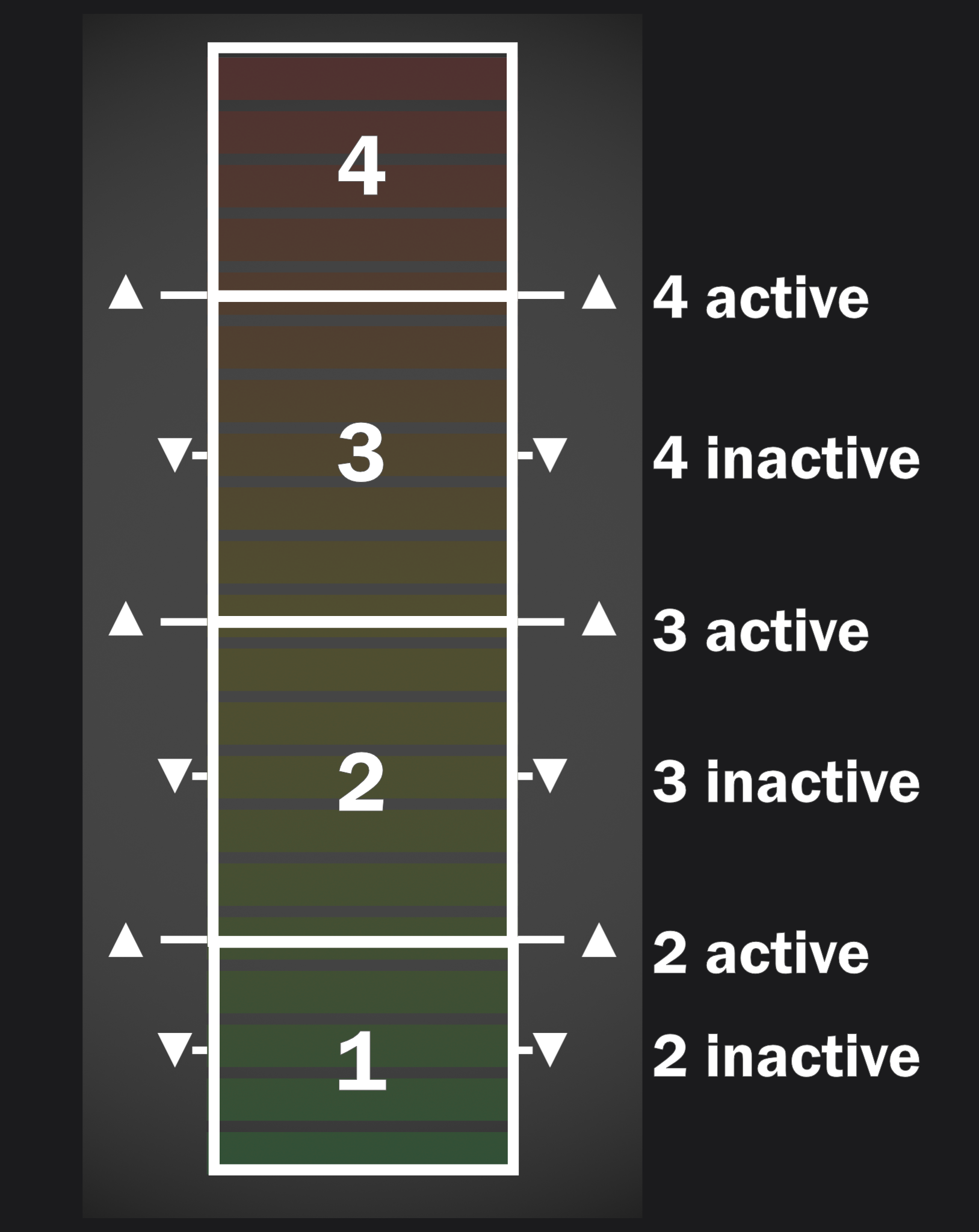 The screen reflects this behaviour by having slightly shifted on and off thresholds for each level.